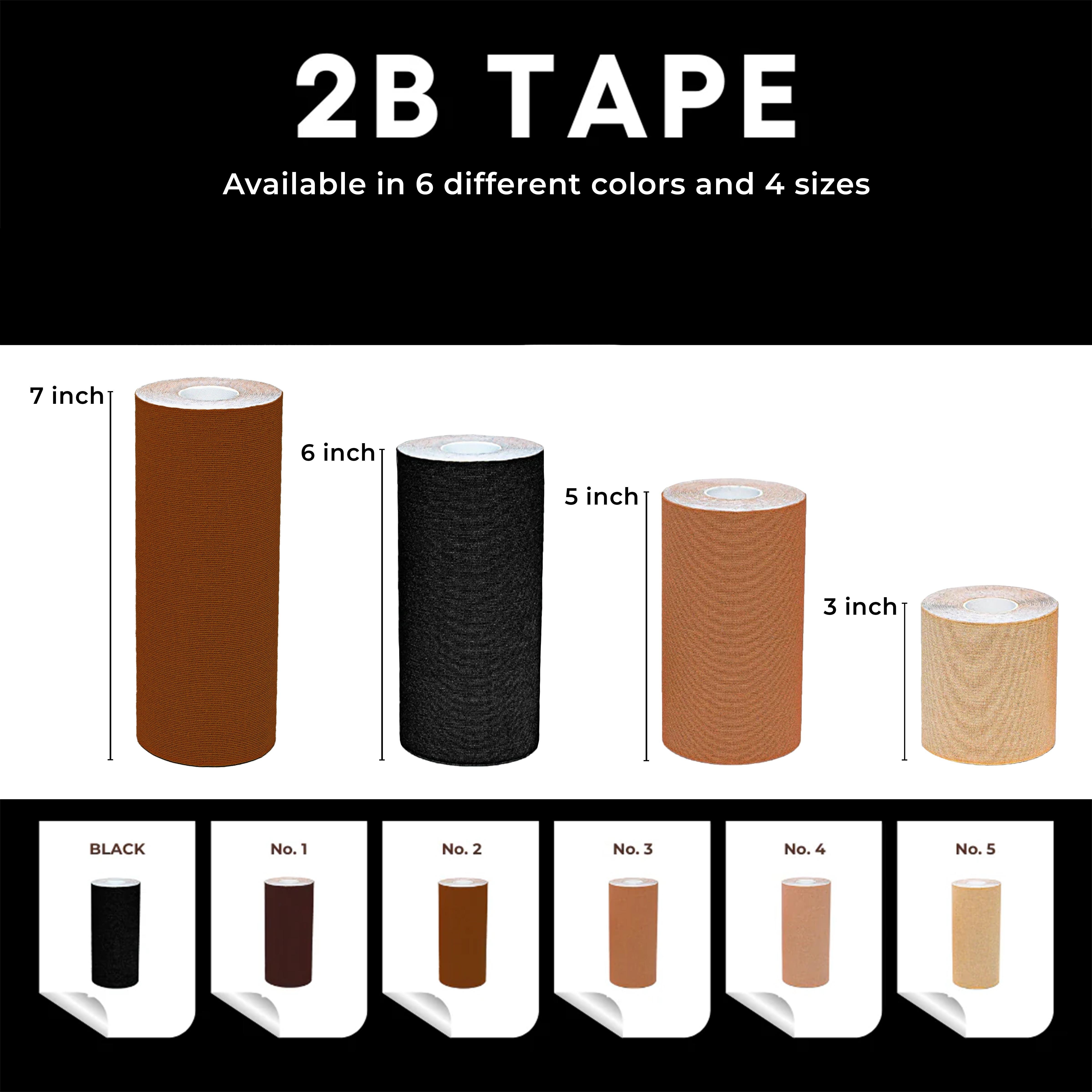 2b Tape comes in five (5) nude tones as well as black. You can find a visual example of what these shades look like in the image below!